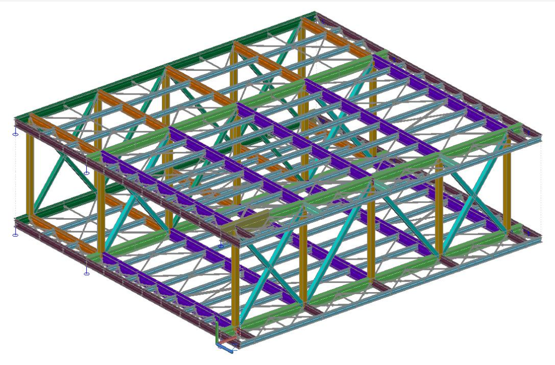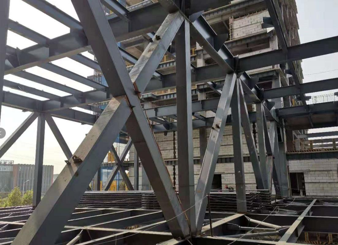 預(yù)制構(gòu)件主要包括預(yù)制鋼梁、鋼柱、鋼桁架、桁架鋼筋樓承板等。項(xiàng)目地下部分為型鋼混凝土組合結(jié)構(gòu),地上部分為裝配式鋼結(jié)構(gòu),其中A塔樓為鋼框架-中心支撐結(jié)構(gòu),結(jié)構(gòu)抗震等級(jí)為三級(jí),其中鋼柱為二級(jí);B塔樓為鋼框架結(jié)構(gòu),結(jié)構(gòu)抗震等級(jí)為三級(jí),其中鋼柱為二級(jí);裙樓為鋼框架結(jié)構(gòu),抗震等級(jí)為三級(jí)。A、B塔樓均采用矩形鋼管混凝土柱,裙房采用矩形鋼管柱,鋼梁均為焊接H型鋼。連廊部分為鋼桁架結(jié)構(gòu),其中柱、斜腹桿為矩形鋼管,主梁為焊接H型鋼,樓板采用鋼筋桁架樓承板。連廊為整體桁架式無柱跨層大空間,空間尺度達(dá)到30mx28mx9.6m(H),為工廠分段預(yù)制,工業(yè)化程度極高。