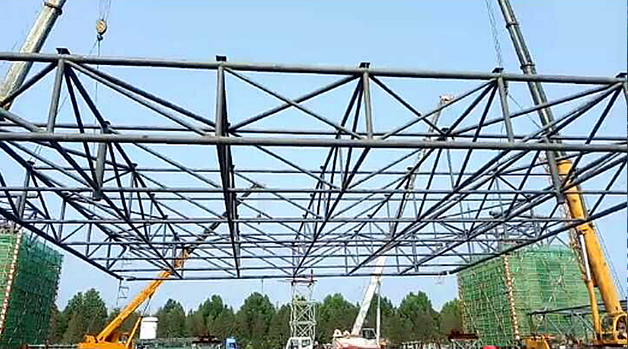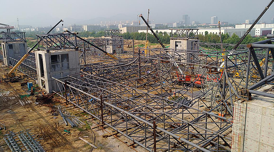 4、在吊裝方面,展館采用原位地面拼裝,整體提升的方式進(jìn)行。展館屋頂桁架原位地面拼裝的高度高達(dá)到11.2m,原采用設(shè)置臨時支撐并單榀吊裝再填補(bǔ)兩榀桁架之間連桿的方式進(jìn)行,該方式高空填補(bǔ)連桿較多,工人長時間高空作業(yè)。為了減少長時間高溫登高作業(yè),現(xiàn)場屋頂桁架由原來的11.2m降到2.5m高度進(jìn)行原位拼裝,待屋頂桁架整體拼裝(屋頂桁架整體重45t)完成后,再用二臺80t汽車吊進(jìn)行整體起吊的方式,吊裝至11.2m位置,與主彎弧桁架的立柱定位焊接。該吊裝方式大大降低了高空拼裝時間,平面拼裝尺寸精度、高空焊接質(zhì)量都得到了進(jìn)一步的保證。