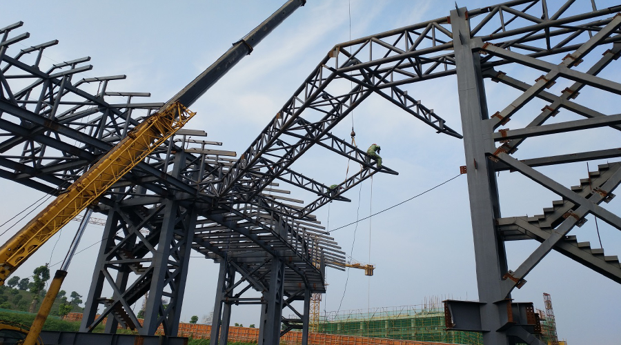 隨著工程緊鑼密鼓地展開,桁架也正式吊裝。經(jīng)現(xiàn)場分析,最終采取地面拼裝成整體,整體吊裝固定。按此施工,工人趴在桁架懸挑部位安裝,提高了施工安全系數(shù)。